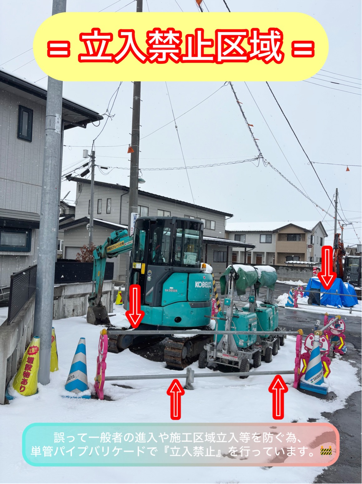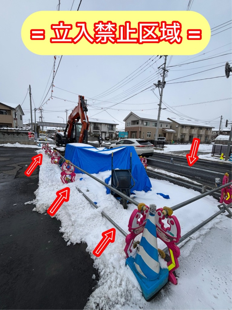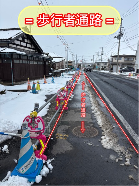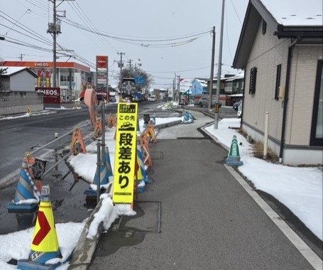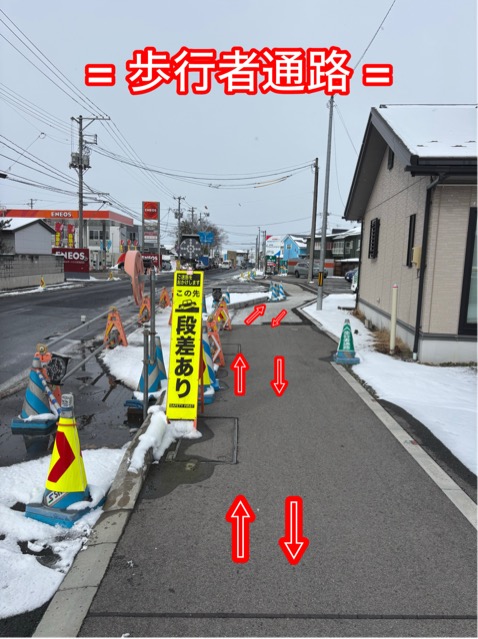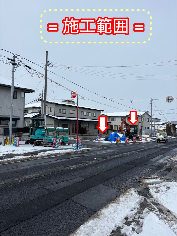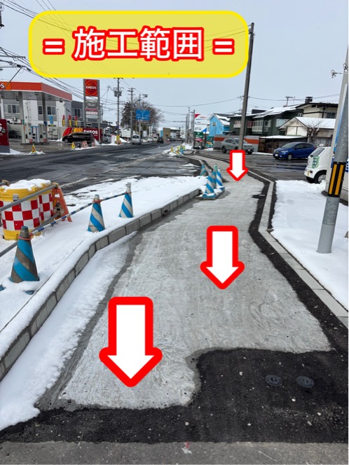 『この工事は、電線地中化に伴い歩道の新設と消雪歩道の設置をしています。🛣』