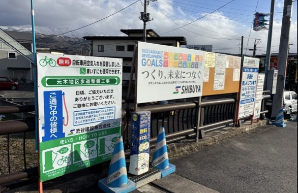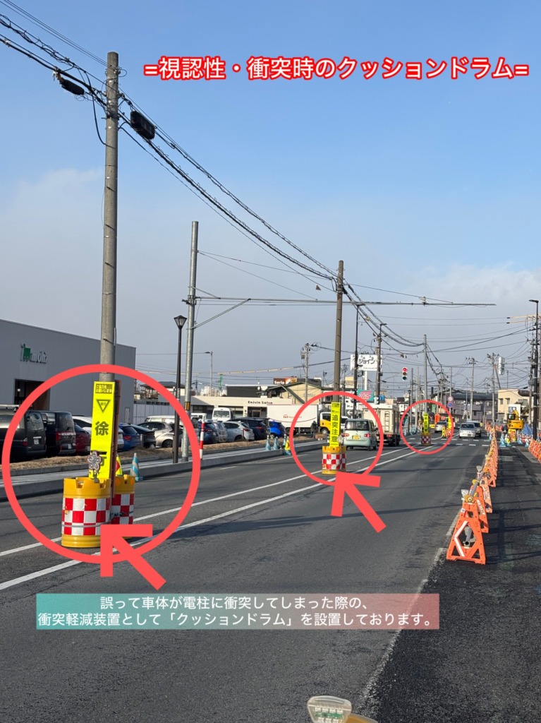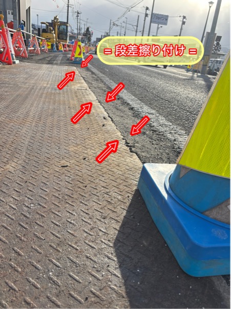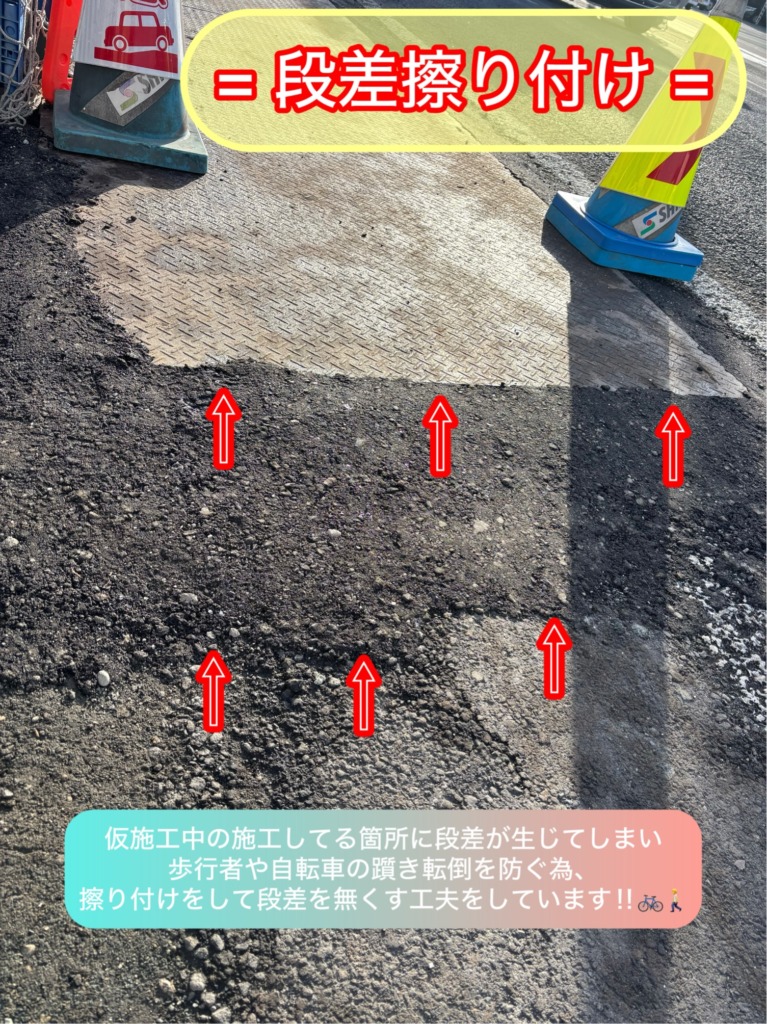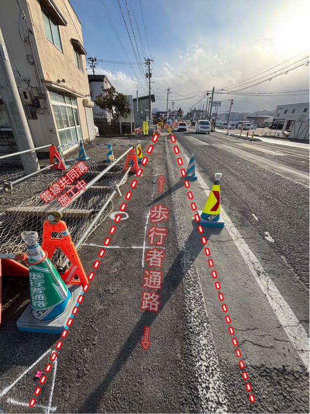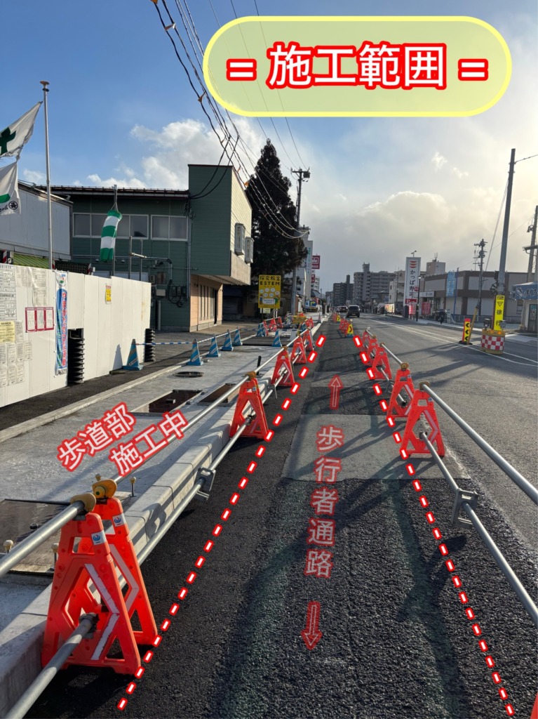 『この工事は、電線地中化に伴い歩道を新しくしています。🛣』